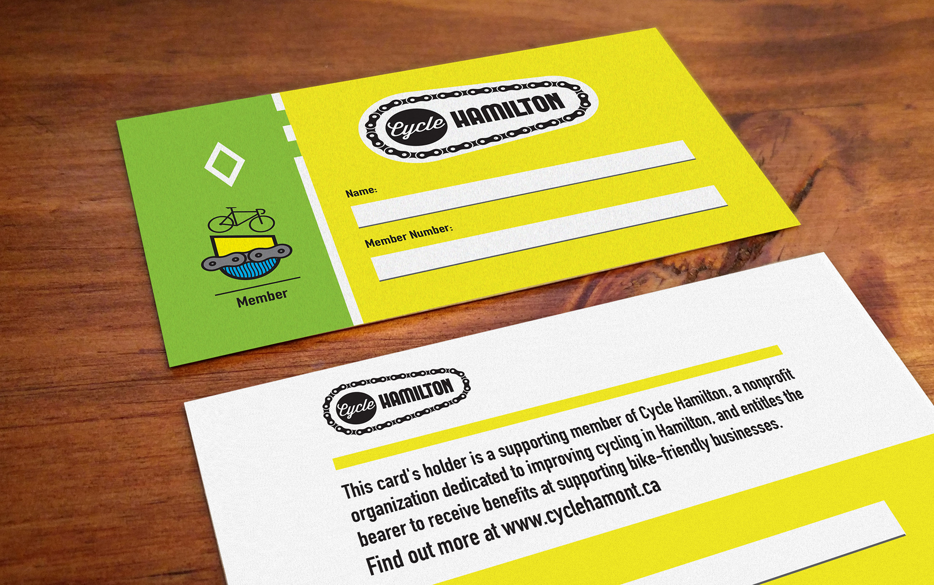 Cycle Hamilton needed membership cards for their newly created organization. I was asked to create a design that would work across mutiple tiers of membership that incorporated their logo. In this design is a brand new member crest and a side bar that changes colours based on the member's tier.